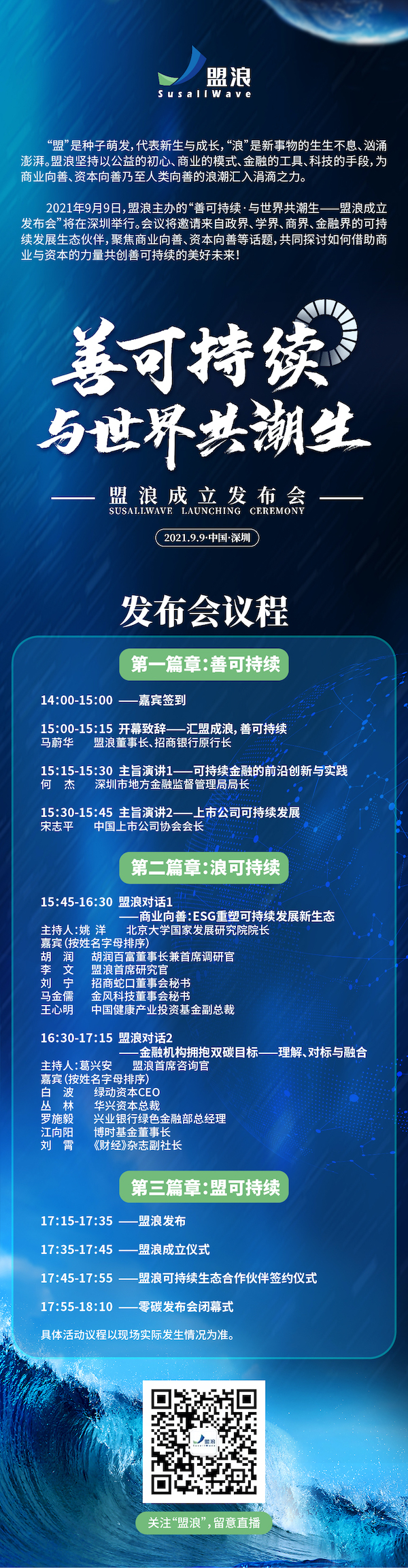 2021年9月9日,盟浪主办“善可持续·与世界共潮生——盟浪成立发布会”将在深圳举行。本次发布会第一场圆桌对话主题为“商业向善:ESG重塑可持续发展新生态”,现场将邀请来自各界专业人士共同探讨企业如何践行ESG发展理念,在可持续发展管理中获益,创造社会价值的同时实现企业长久的可持续发展。