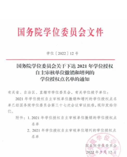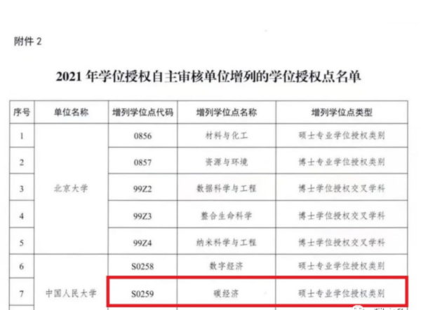 2022年7月12日,国务院学位委员会发布《关于下达2021年学位授权自主审核单位撤销和增列的学位授权点名单的通知》(学位〔2022〕12号)。中国人民大学新增3个学位授权点,其中2个为硕士专业学位授权类别,1个为博士专业学位授权类别。应用经济学院的“碳经济”硕士专业学位授权点成功获批。