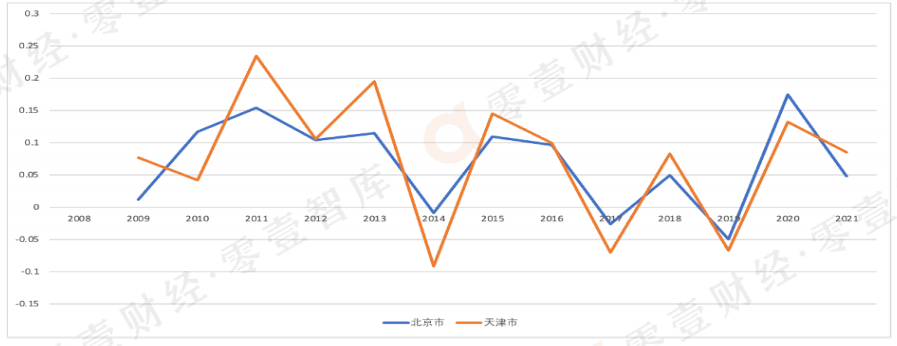从年度增长率看,2008年以来,天津市的绿色技术创新指数增速有8个年度快于北京市。