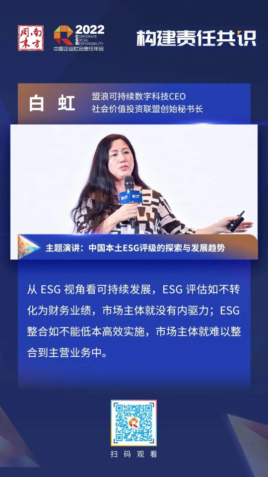 2022年7月28日-29日,由南方周末报社主办的ESG发展高峰论坛暨第十四届中国企业社会责任年会在广州举行。本次活动集结了众多专家学者、企业高管、机构及媒体的优秀代表,深入挖掘ESG在中国的发展趋势,探索企业ESG实践发展的新路径,共话企业履责的新情势、新方法、新实践,一起构建责任共识。盟浪可持续数字科技CEO、社会价值投资联盟创始秘书长白虹出席活动,并以《中国本土ESG评级的探索与发展趋势》为题作了演讲分享。