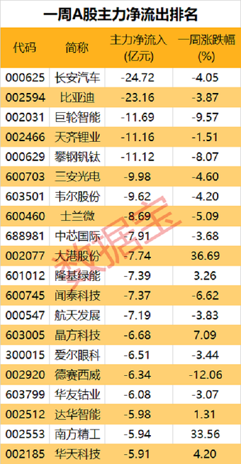 剔除近一月上市新股,5股净流出额逾10亿元。两大汽车龙头,长安汽车和比亚迪均遭到主力23亿元以上资金抛售。主力也相继出走多只电子板块热门股,三安光电、韦尔股份和士兰微净流出额均在8亿元以上。