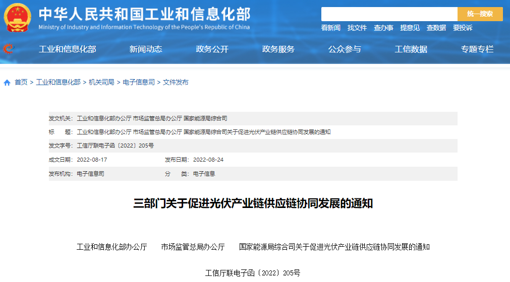 8月24日,工信部等三部门联合发布《关于促进光伏产业链供应链协同发展的通知》(下称《通知》)。《通知》指出,要引导各类资本根据双碳目标合理参与光伏产业,并严厉打击光伏行业领域哄抬价格、垄断等违法违规行为。