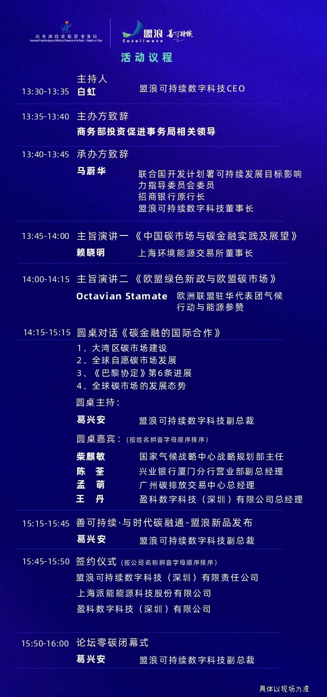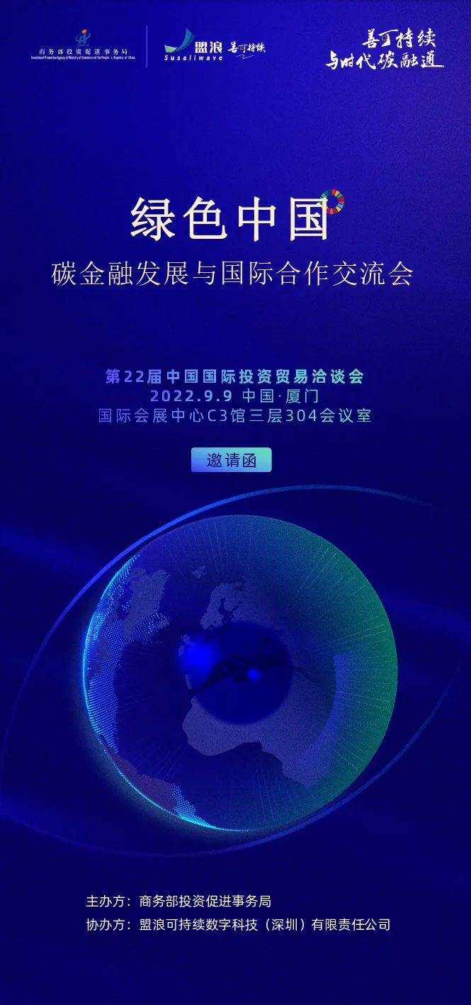 导语:2022年9月9日,第二十二届中国国际投资贸易洽谈会“碳金融发展与国际合作交流会”将在厦门国际会展中心C3馆三层304会议室举办。此次活动由商务部投资促进事务局主办(简称“商务部投促局”),盟浪可持续数字科技(深圳)有限责任公司(简称“盟浪”)协办。届时,盟浪将重磅发布盟浪碳融通新品,并作为参展方(展位号:C馆591)进行品牌展示及业务交流。