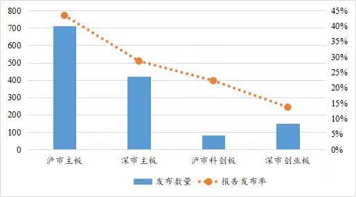从发布报告板块来看,受不同板块监管制度和规则影响,沪市主板的发布数量和发布率均最高,发布数量达到714,发布率达到43.48%。其次是深市主板,发布数量达到420,发布率达到28.67%。