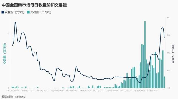 中国碳市场收盘价和交易量趋势 数据来源:Refintiv