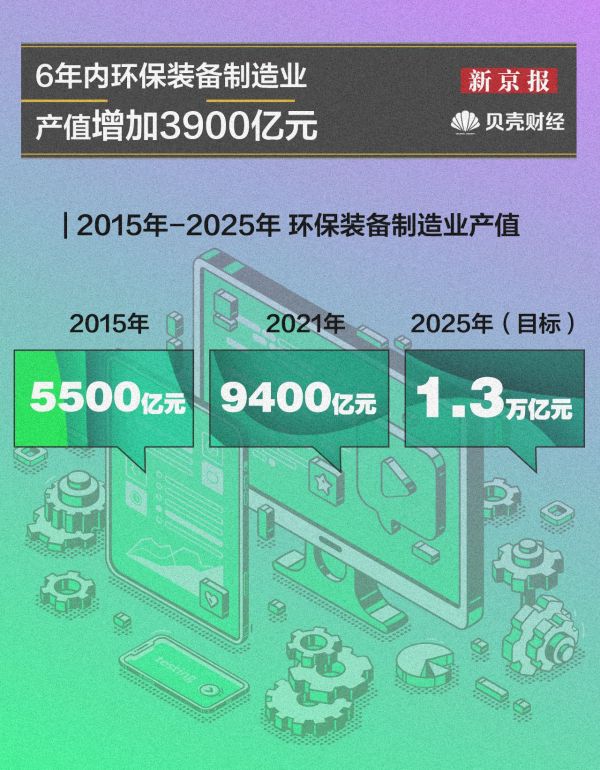 “绿色低碳转型”背景下,环保产业进入“快车道”。自2015年以来,环保装备制造业产值年复合增长率达9.3%,从2015年的5500亿元增至2021年的9400亿元。工信部发布数据显示,力争到2025年,环保装备制造业产值提高至1.3万亿元。