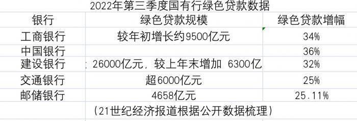 据21世纪经济报道记者根据上市银行三季报不完全统计,截至10月28日,包括工商银行、中国银行、建设银行、交通银行、邮政储蓄银行五家国有大行公布了相关数据情况,绿色贷款增幅均在25%以上。